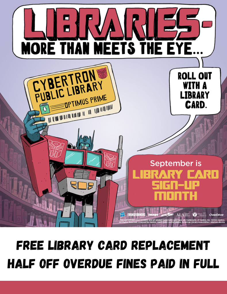 This year’s host of National Library Card month festivities is Optimus Prime from Transformers. Optimus’s slogan, “there’s more than meets the eye,” showcases the ways library services go beyond books, and highlights the other services a library card can give patrons access to like research assistance, language learning and job help.
